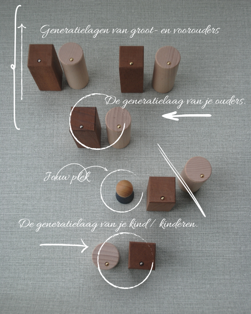 Dat begint bij "het leven". Van boven naar onder in zo'n opstelling zie je ook de richting waarin het leven wordt doorgegeven. Het begon bij de voorouders, via de grootouders en de ouders naar jou en zo verder naar de generaties die komen (en/of in je maatschappelijke en systemische bijdrage).